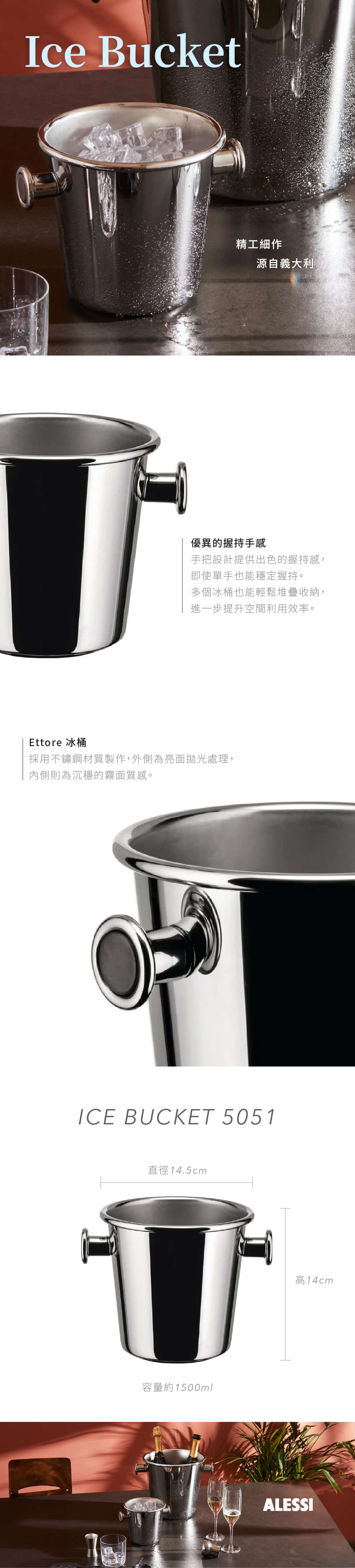 這款冰桶於 1979 年推出,結合實用功能與設計美感,是餐桌、吧台或居家招待時兼具實用與裝飾性的經典酒具。